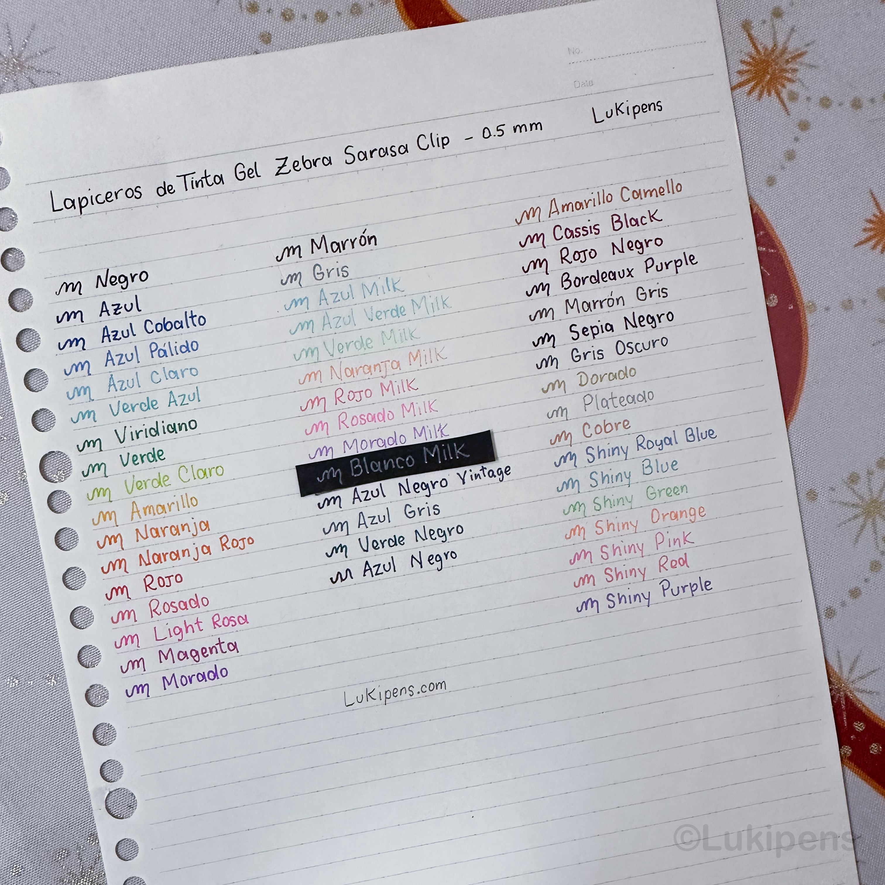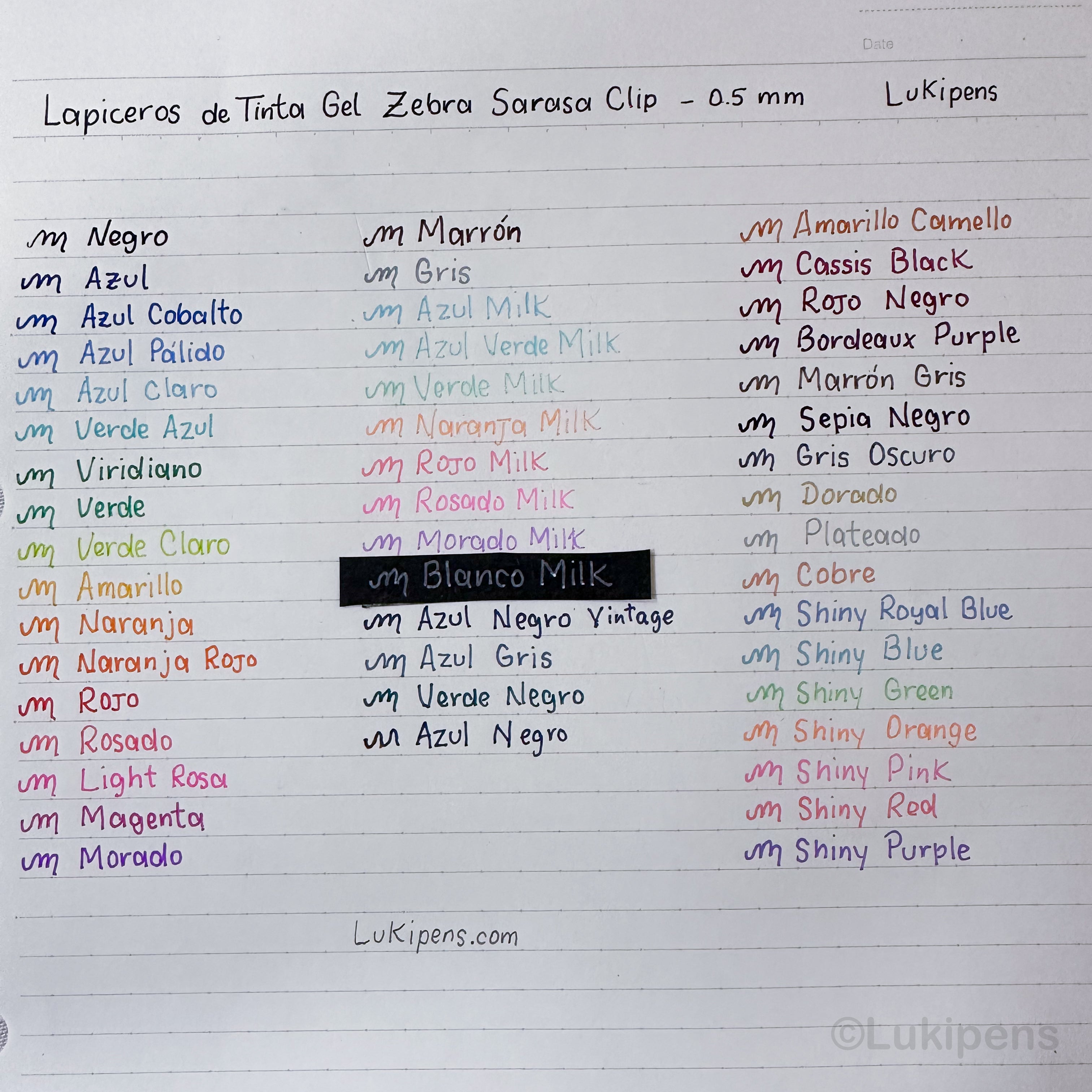 Negro, Azul, Rojo, Azul Negro, Azul Cobalto, Azul Pálido, Azul Claro, Azul Verde, Verde Esmeralda, Verde, Verde Claro, Rojo Naranja, Amarillo, Rosa Claro, Rosa, Magenta, Morado, Marrón, Gris, Rosa Leche, Rojo Leche, Morado Leche, Blanco Leche, Azul Oscuro, Negro Casis, Amarillo Camel, Dorado, Plateado, Cobre, Azul Real Brillante, Azul Brillante, Verde Brillante, Naranja Brillante, Rosa Brillante, Rojo Brillante, Morado Brillante.